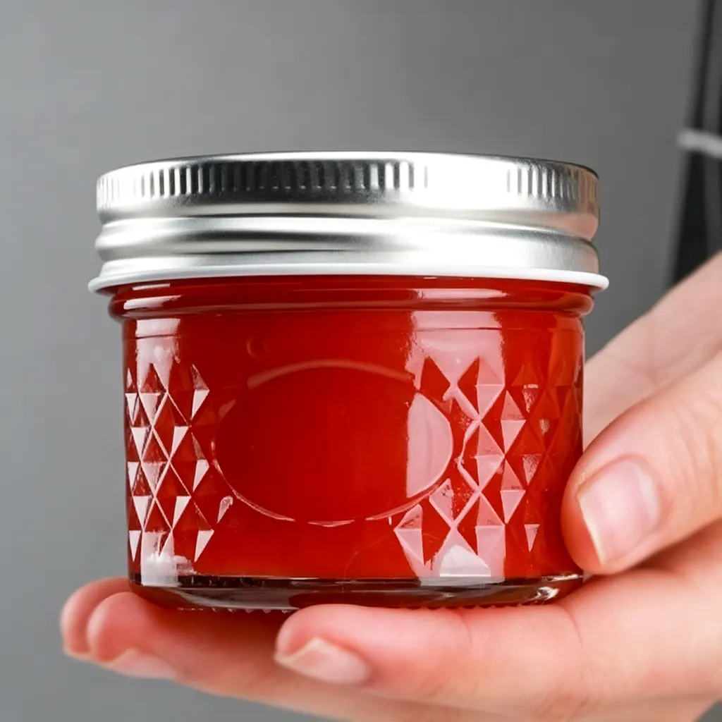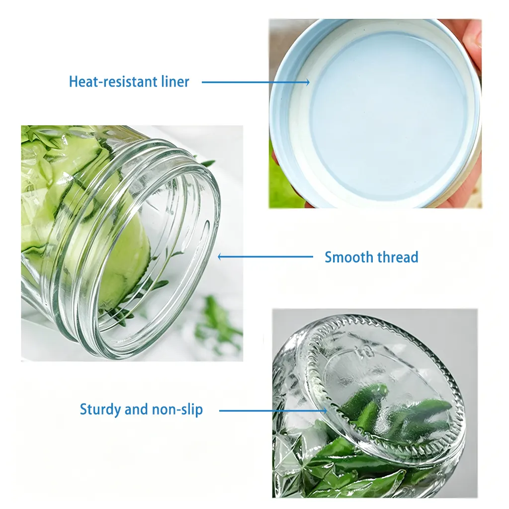 Una forma cilíndrica con una superficie texturizada en relieve; estos frascos de vidrio tipo mason con tapa presentan un aspecto esbelto, elegante y vintage. El cuerpo del frasco de vidrio es transparente y resalta su contenido, por lo que resulta ideal para la presentación de alimentos, como mermelada, miel o salsa. Su diseño con boca ancha facilita su llenado y limpieza. Cada pequeño frasco de vidrio incluye una tapa metálica duradera con cierre de rosca, lo que garantiza una estanqueidad fiable para almacenamiento y embalaje en vidrio.