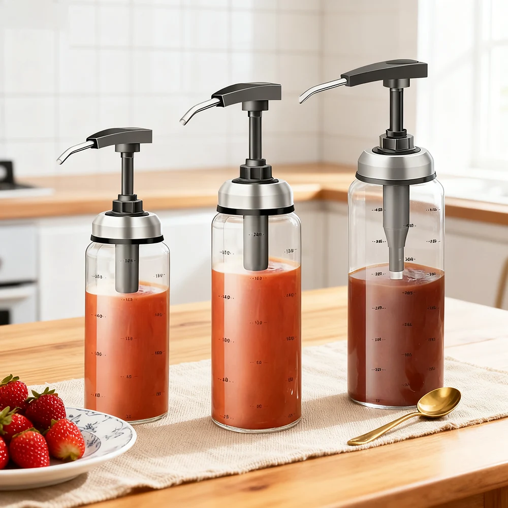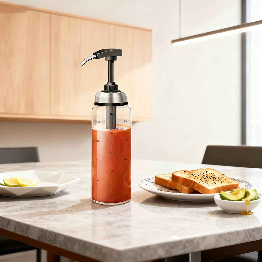 Bu bbq sos şişesi, şık siyah ve gümüş renkli metal pompa başlığına sahip şeffaf, ölçekli cam bir tabana sahiptir. Fonksiyonel ve zarif tasarımı sayesinde sosları hassas bir şekilde dağıtmanız mümkün olur.